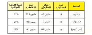 يُظهر التحليل الكمي المستند إلى البيانات المستخلصة من المنصات الثلاث (تيكتوك، فيسبوك، وإكس) تبايناً واضحاً في حجم التفاعل وانتشار خطاب الكراهية. وقد تم قياس عدد الحسابات، والمتابعين، ونسبة المحتوى العدائي لتحديد المنصات الأكثر تأثيراً وخطورة في نشر الخطاب العدائي.