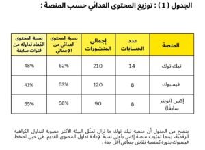 بلغ إجمالي المواد التي خضعت للتحليل أكثر من 420 منشورًا ومقطعًا مصورًا، موزعة بين المنصات الثلاث على النحو الآتي: