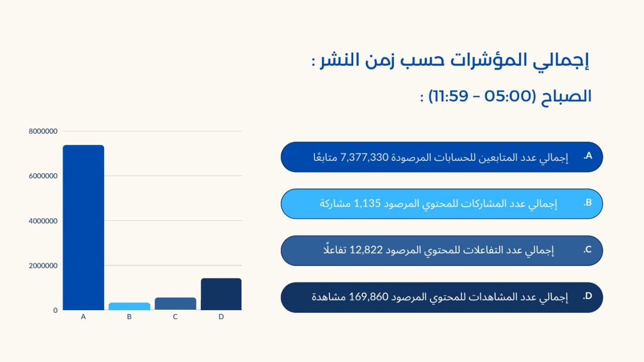 أما من حيث التوقيت، فقد سجلت الفترة المسائية النسبة الأعلى عددًا بـ131 حالة (36.9%)، وكانت الأكثر جذبًا للمشاهدات (56.4%) والتفاعلات (85.9%)، بينما تميزت فترة الظهيرة بكونها اللحظة الأبرز لإعادة النشر عبر المشاركات بنسبة 91.2% من إجمالي المشاركات، في حين ظلت الفترة الصباحية الأدنى من حيث العدد والتأثير. وعند المقارنة بالشهر السابق، يتضح أن المساء استمر كذروة زمنية للنشر، غير أن يوليو تميز بتضاعف حجم التفاعل، ما يشير إلى تعمق الارتباط بين توقيت النشر ومستويات الجذب والتأثير.