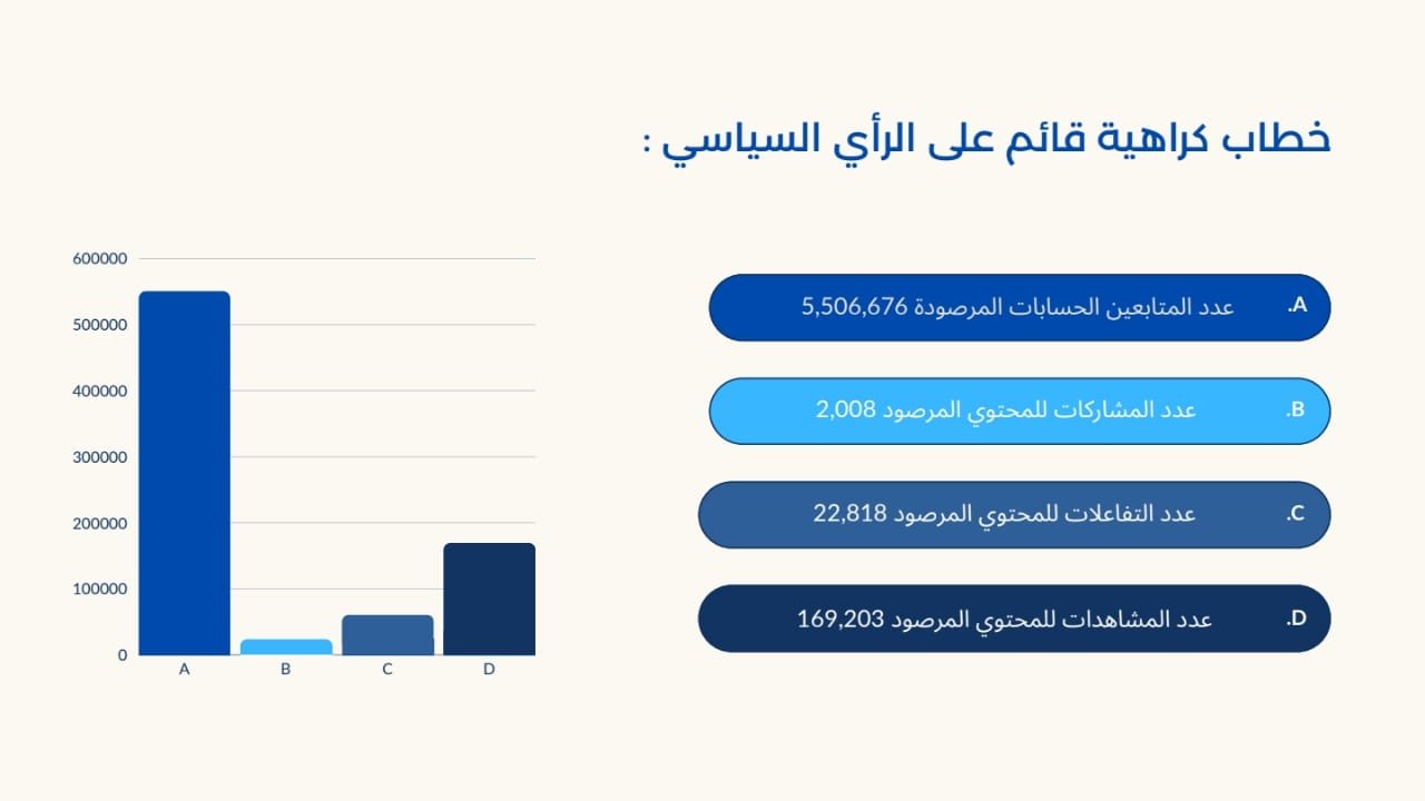 – نماط الخطاب: الخطاب الخطير (36.3%) والعرقي (34.9%) تصدّرا المشهد، مقابل تراجع نسبي للخطاب السياسي (28.7%).
