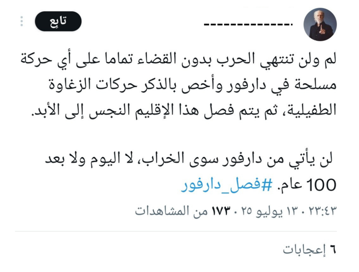 الدعوات لانفصال دارفور أو طرد جماعات معينة تعني تحويل الانقسام السياسي إلى قطيعة اجتماعية وجغرافية.
