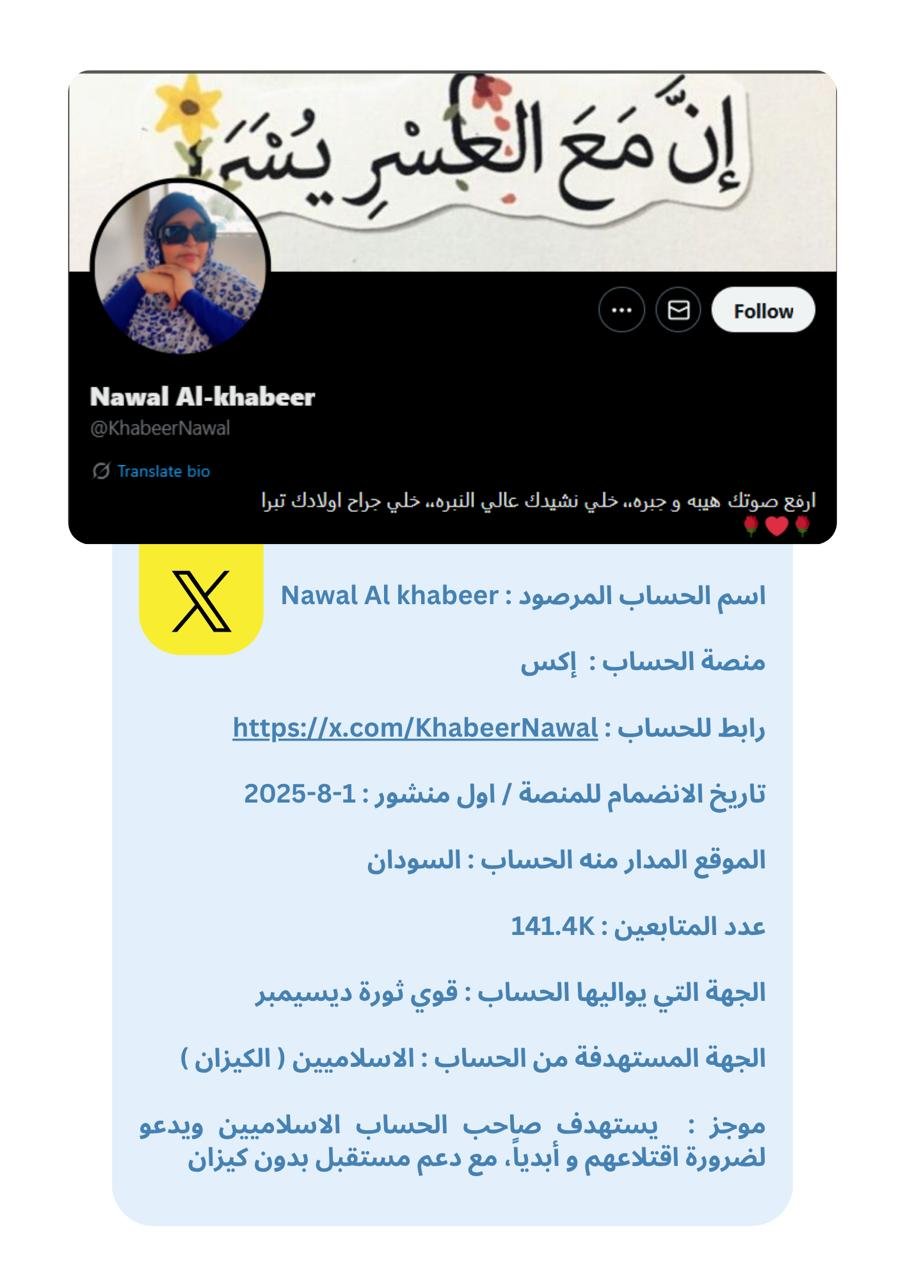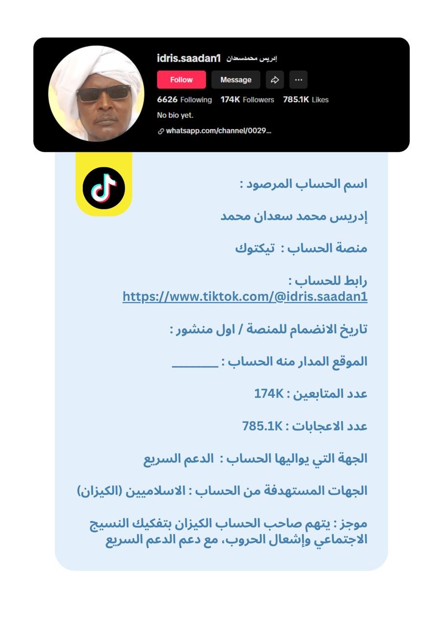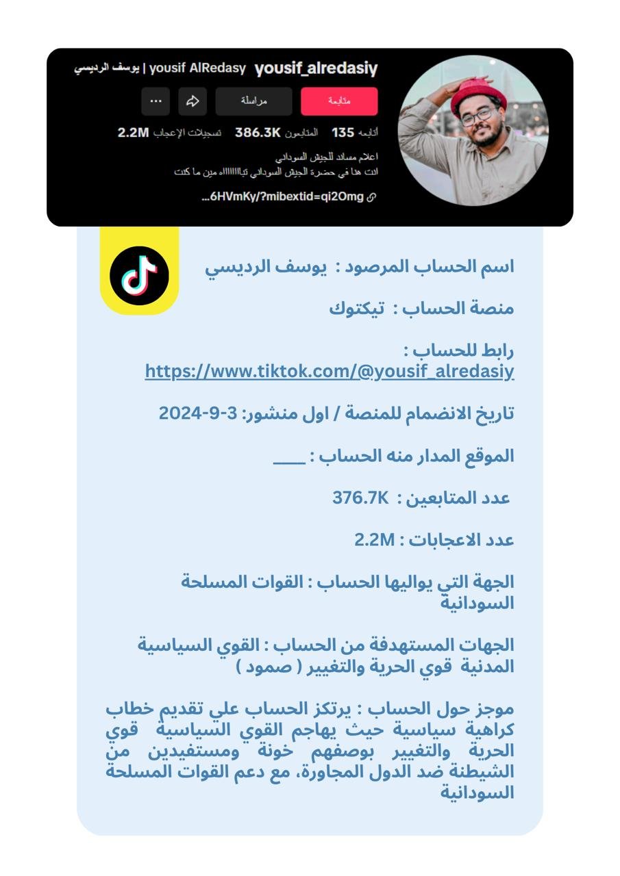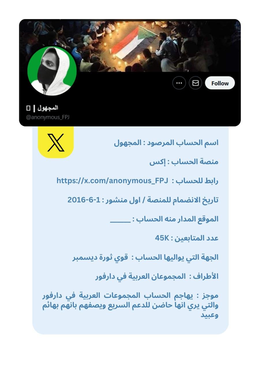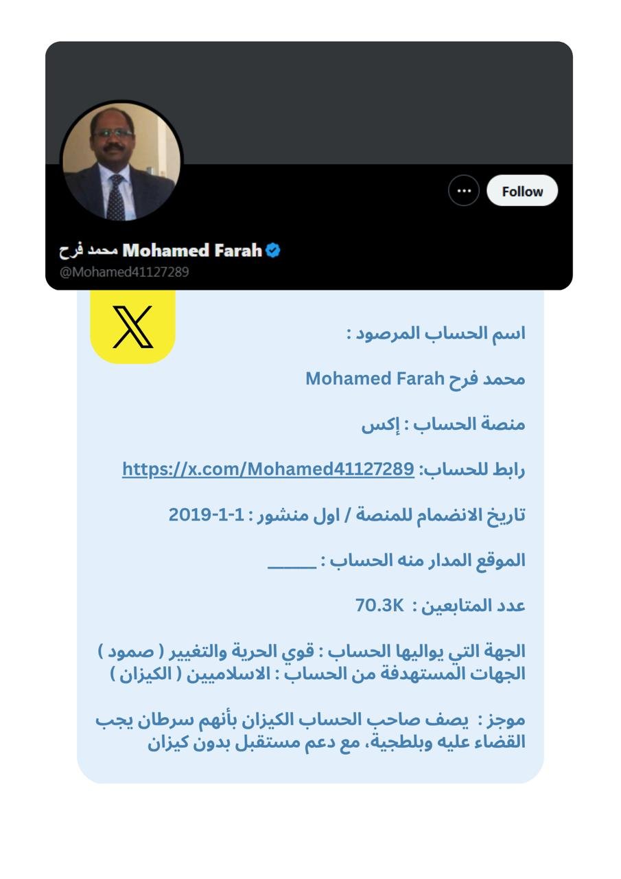 تُقدَّم البيانات في هذه النشرة في شكل بروفايلات موجزة لكل حساب، تتضمن المعلومات العامة المتاحة ، إلى جانب تحليل موجز للأنماط ومستوى الخطورة. وقد تم الحرص على صياغة المحتوى بطريقة موضوعية وأخلاقية تراعي عدم التحريض أو التشهير، وتخدم أغراض البحث والتوثيق والمناصرة الإيجابية.