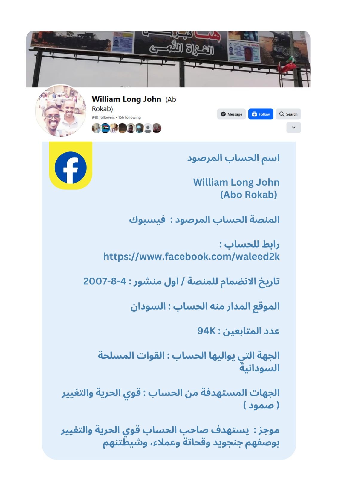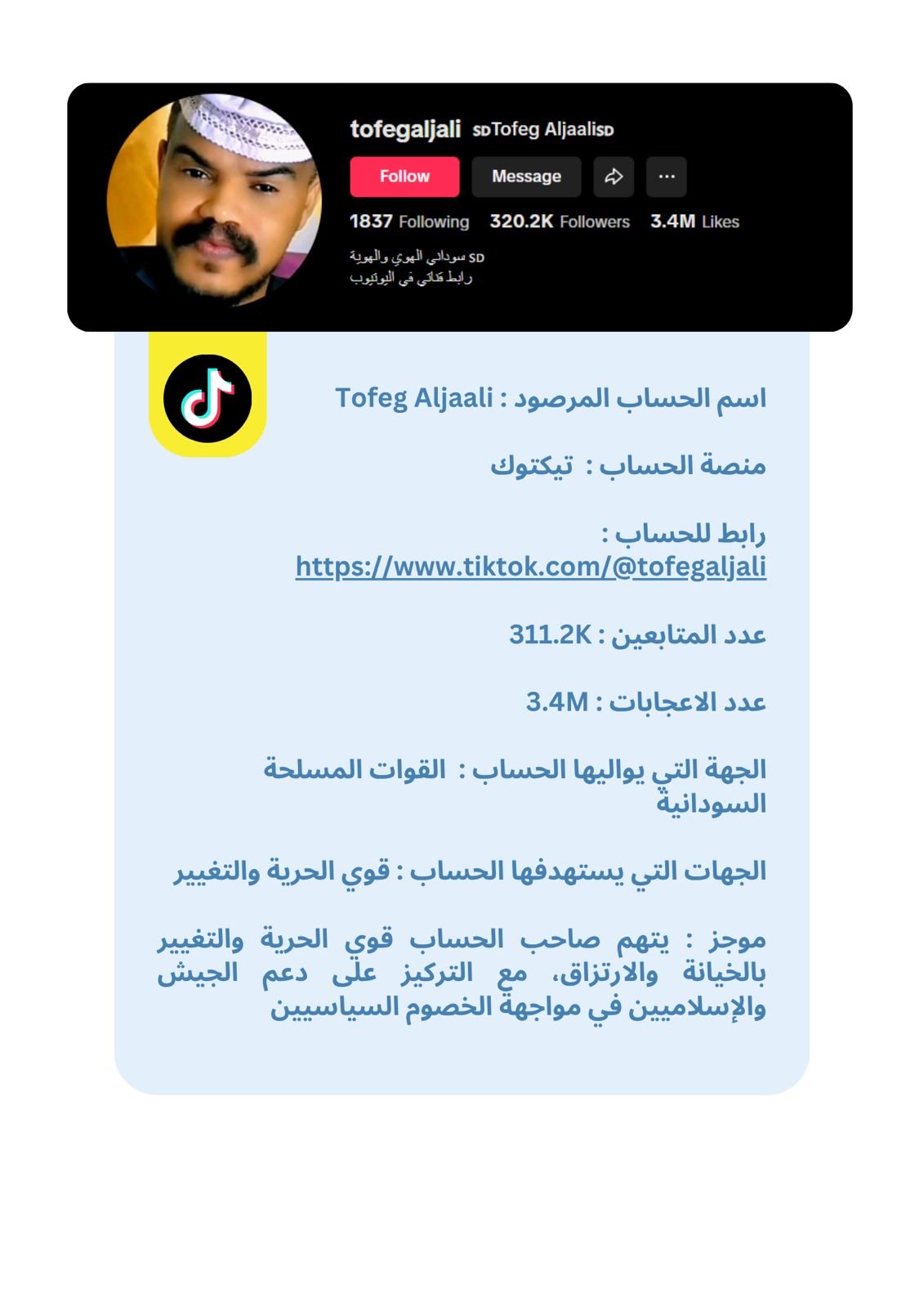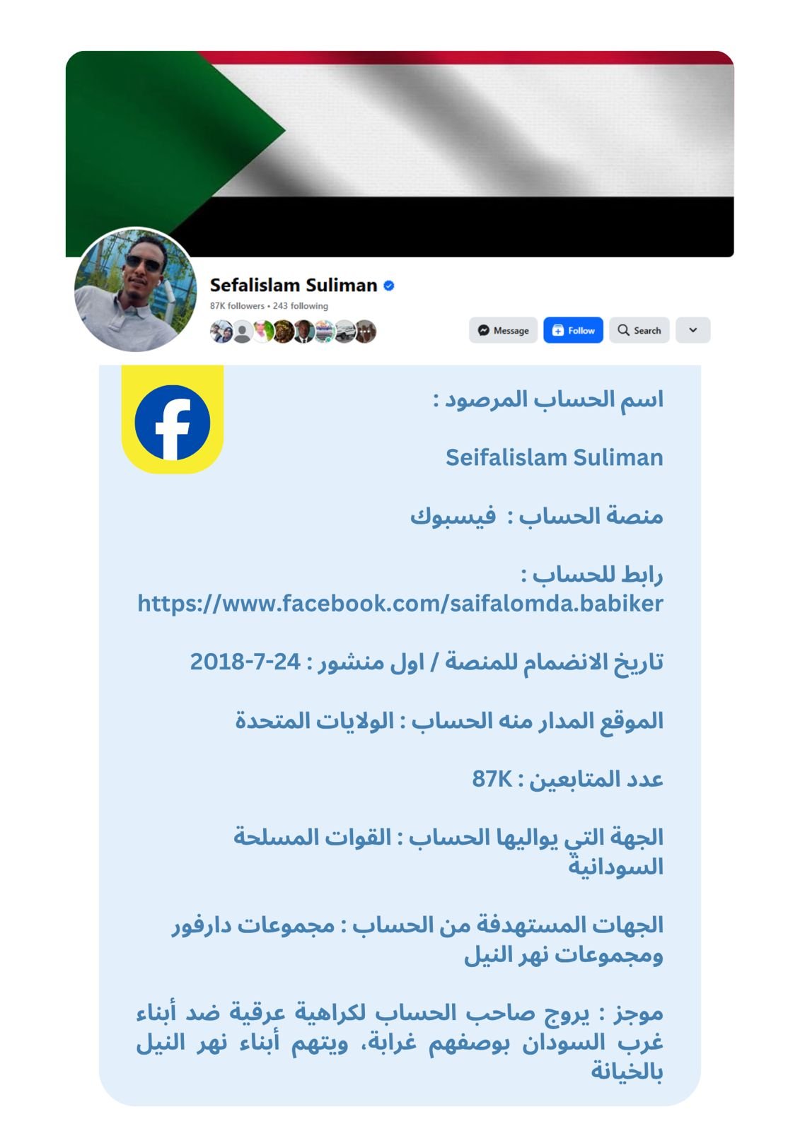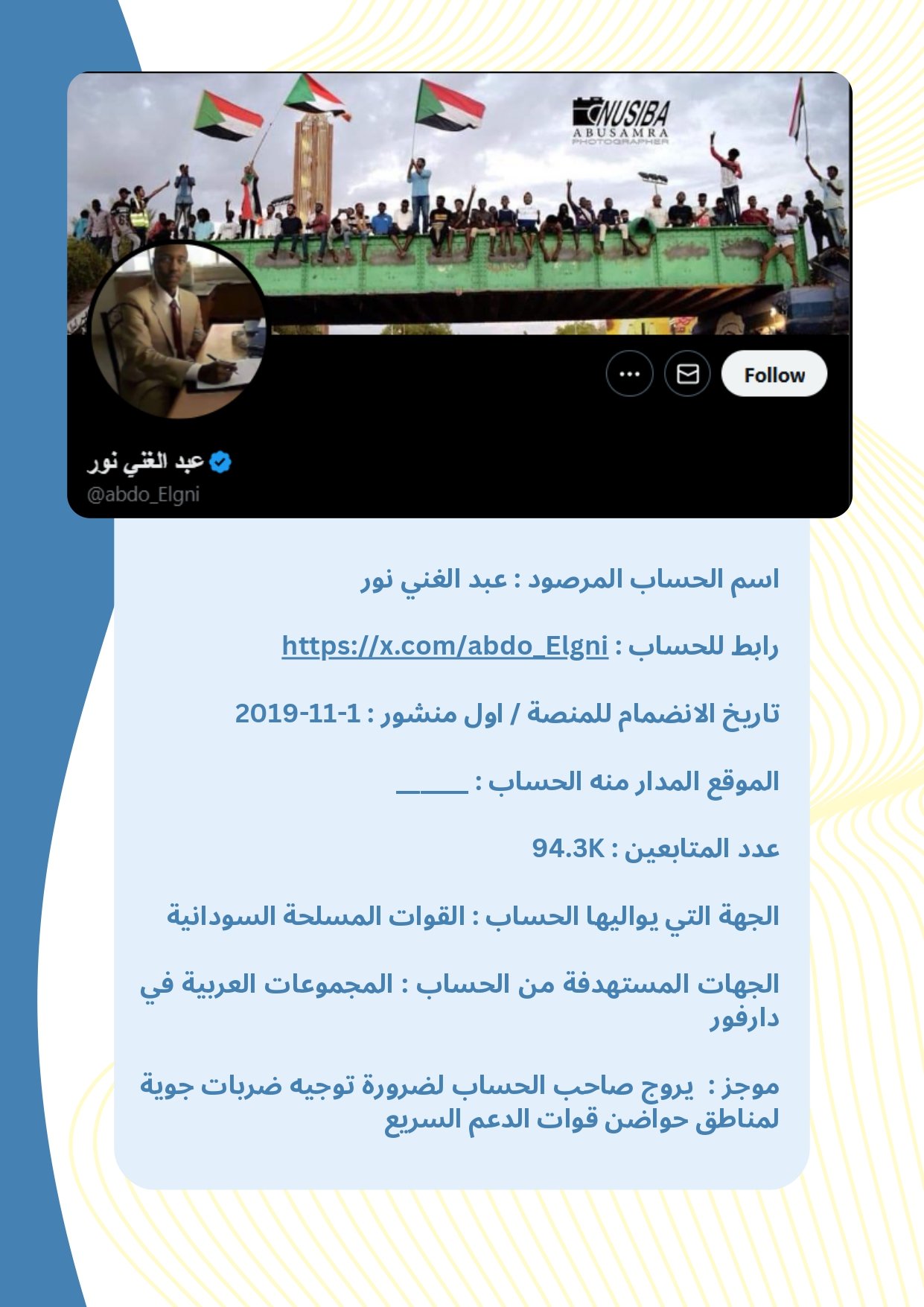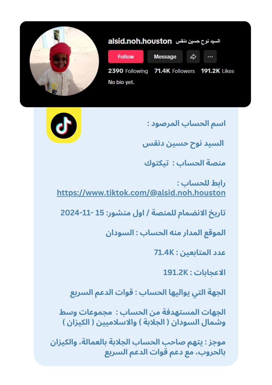 تُقدَّم البيانات في هذه النشرة في شكل بروفايلات موجزة لكل حساب، تتضمن المعلومات العامة المتاحة ، إلى جانب تحليل موجز للأنماط ومستوى الخطورة. وقد تم الحرص على صياغة المحتوى بطريقة موضوعية وأخلاقية تراعي عدم التحريض أو التشهير، وتخدم أغراض البحث والتوثيق والمناصرة الإيجابية.